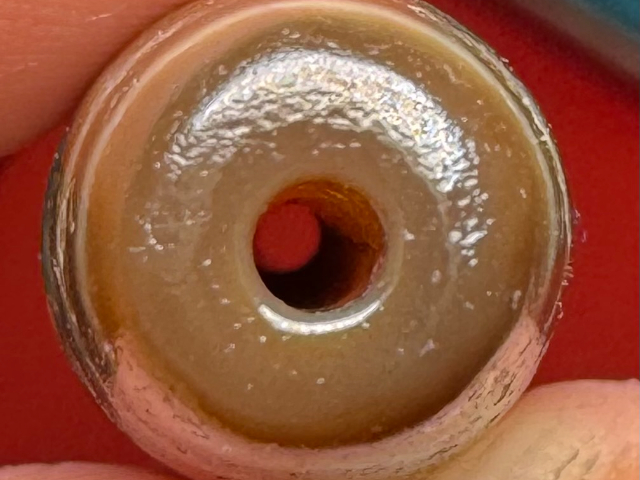 從器物功能演變到角度的考察,這顆地覺醒十五眼天珠的孔徑直徑約 有3 毫米,內(nèi)壁呈現(xiàn)明顯的雙向打孔對(duì)接痕跡,這種打孔方式在公元 1 世紀(jì)前后的象雄飾品中極為常見。孔徑邊緣的磨圓度達(dá) R0.5 毫米,經(jīng)測(cè)算需至少數(shù)千次繩索摩擦才能形成,結(jié)合包漿中檢測(cè)出的羊毛纖維殘留,可推斷其曾作為頸飾長(zhǎng)期佩戴。珠體中段的磨損程度略高于兩端,符合佩戴時(shí)自然垂墜的受力規(guī)律,這種使用痕跡的分布特征,為還原古代藏族服飾搭配習(xí)慣提供了具象參考。